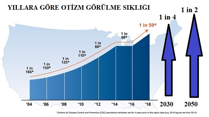 ABD'de otizm olma ihtimali 1970 yılında 10.000'de 1 iken şu anda bu ihtimal 50' de 1'e yükseldi, yani gün geçtikçe otizm görülme sıklığı artıyor. 2030 yılında doğan her dört çocuktan birinin, 2050 yılında ise doğan her 2 çocuktan birinin otizmli olacağı ön görülüyor. Aslına bakarsanız endüstriyel gıdalarla (yanlış beslenme) beraber TüM HASTALIKLARDA ciddi bir ARTIŞ görülmekte. Yani DOĞRU BESLENME ile sadece OTİZM değil BİR çOK HASTALIK engellenebilir veya sağaltım sağlanabilir.